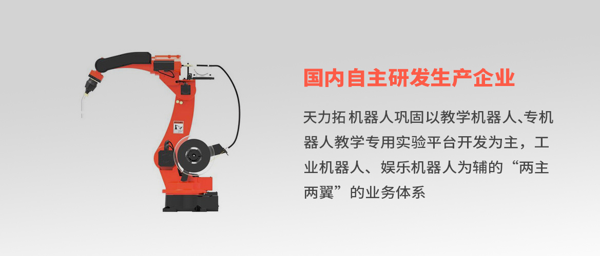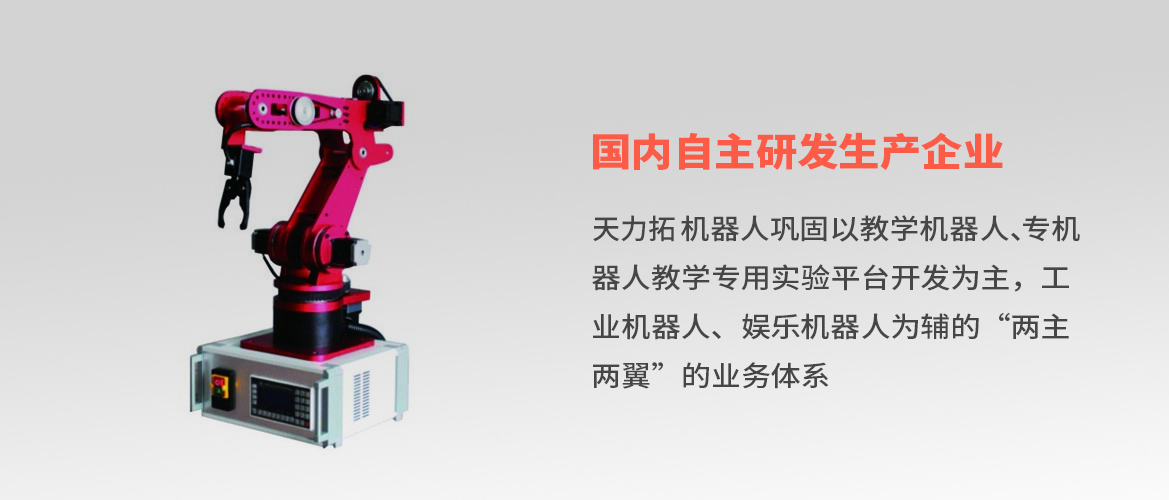 天力拓机器人巩固以教学机器人、专机器人教学专用实验平台开发为主,工业机器人、娱乐机器人为辅的“两主两翼”的业务体系,倾力打造以天力拓智能机器人制造领域的新名片,与北京航空航天大学、上海交通大学、重庆大学、天津科技大学、海尔、通用电气等国内外知名机构建立战略合作关系,成为智能机器人联盟成员,实现了企业品牌向高端领域的华丽蜕变。我们联合国内机器人行业优质资源,发挥产业整合优势,积极开拓娱乐机器人、行业机器人等新领域,实现从“两主两翼”到“两主N翼”的延伸拓展。我们以科技创新为依托,以人文精神为内涵,实施绿色科技机器人战略,研发更加智能的人性化产品,将高品质和人文精神的元素源源不断地注入到我们开发的每一类产品中,致力于为客户缔造更好更优质的服务,天力拓机器人将秉承“为机器人而生”朴实厚重的研发精神,坚持以市场需求为导向,以创新创意为动力,大力提升质量效益,全力推进改革创新,为机器人行业打造国内领先的研发产品!